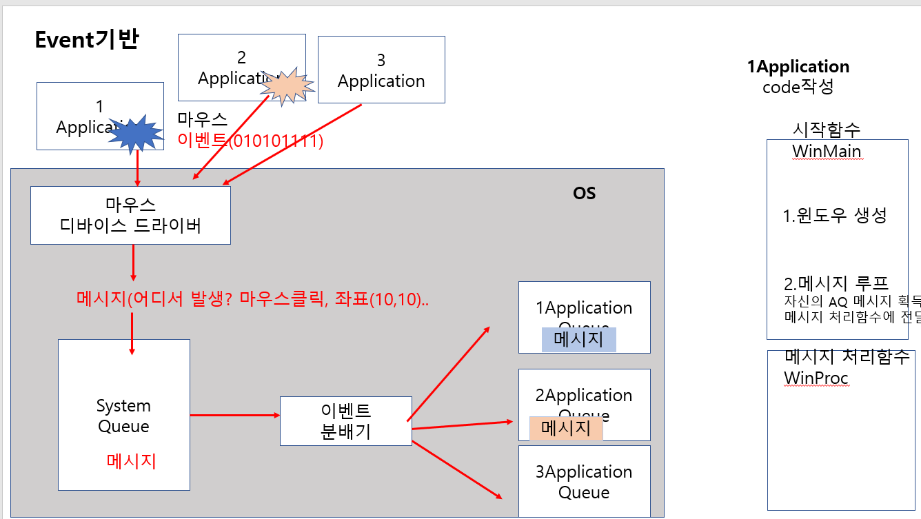 예를 들어 마우스 클릭 이벤트를 발생 시키면 마우스 디바이스 드라이버를 통해 메시지로 바뀌고